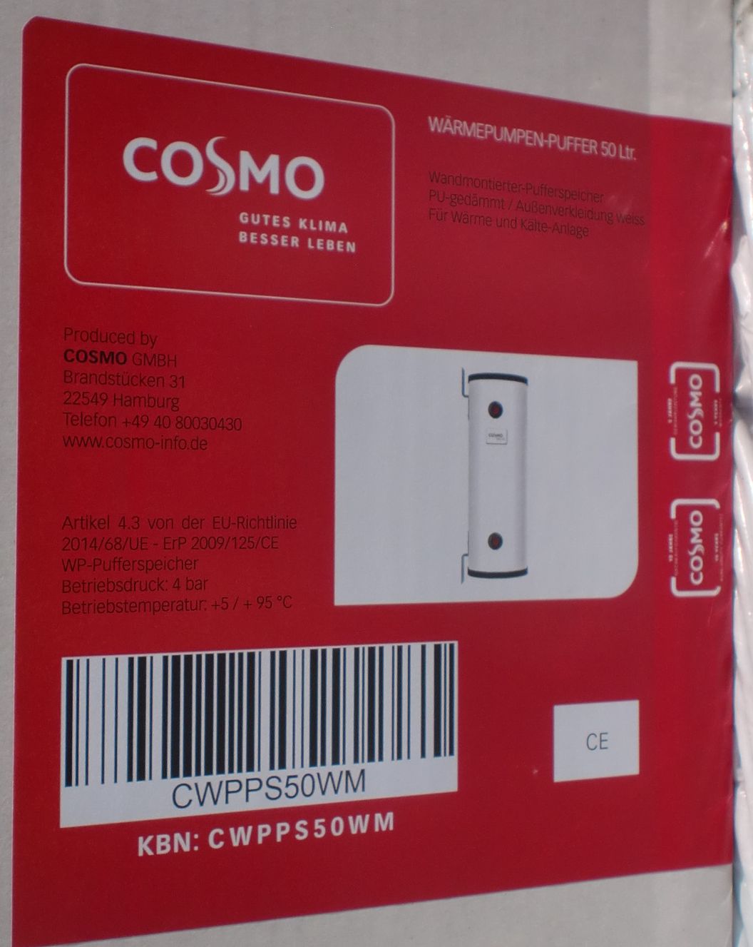 COSMO Wand Wärmepumpen Puffer 50 Ltr. EEK "B" für Wärme u. Kälte, PU-gedämmt