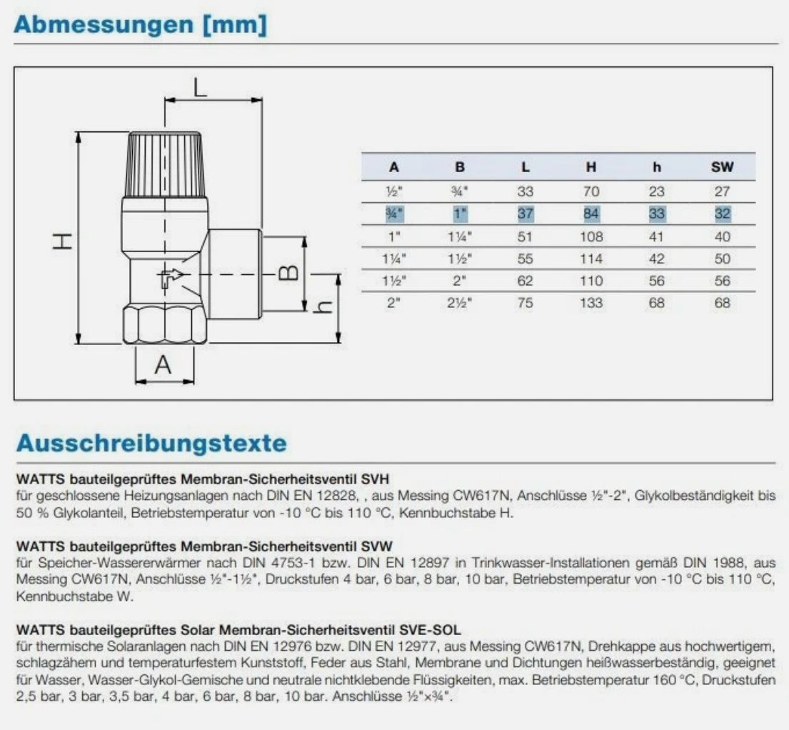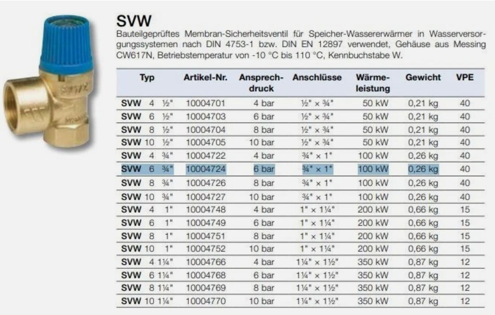 concept Membran Sicherheitsventil SVW f.Warmwasser 3/4" 6 bar für Warmwasserbereiter nach DIN 4753, aus Messing CW617N, Betriebstemperatur von-10 Grad C. bis 110 Grad C., Kennbuchstabe W. Verwendungsbereich Membran Sicherheitsventile SVH werden zur Absicherung von geschlossenen Heizungsanlagen entsprechend DIN 4751 Teil 2, die mit Ausdehnungsgefäßen und mit einer thermostatisch abgesicherten Wasservorlauftemperatur bis 120 Grad C betrieben werden, gegen Drucküberschreitung verwendet. Ausführung-Körper aus Pressmessing: EN 12165-99 CW617N -Membrane aus hitze- und alterungsbeständigem Matetrial -Drehkappe und Federhaube aus schlagfestem Kunststoff -Feder aus Ni-Cr Stahl Ansprechdruck. Der Abblasedruck ist vom Werk auf 4, 6, 8 oder 10 bar eingestellt und durch eine eingepresste Sicherungskappe, die das Bauteileprüfzeichen trägt, gegen Verstellen gesichert. Ein nachträgliches Verstellen ist nicht zulässig und ohne Zerstörung der Sicherheitskappe nicht möglich. Technische Eigenschaften -Anschlüsse Innengewinde- Anlüftvorrichtung nicht zusätzlich belastbar-Federbelastung nicht verstellbar -PN 10 - max. Temperatur: 110 Grad C-min. Temperatur: 10 Grad C. Anwendung Wasser -neutrale Flüssigkeiten Größe: 3/4" Druck: 6 bar Behälter -Inhalt Liter: bis 200-1000, Min.Bestellung 40 Stück concept Artikel-Nr.: 10022004