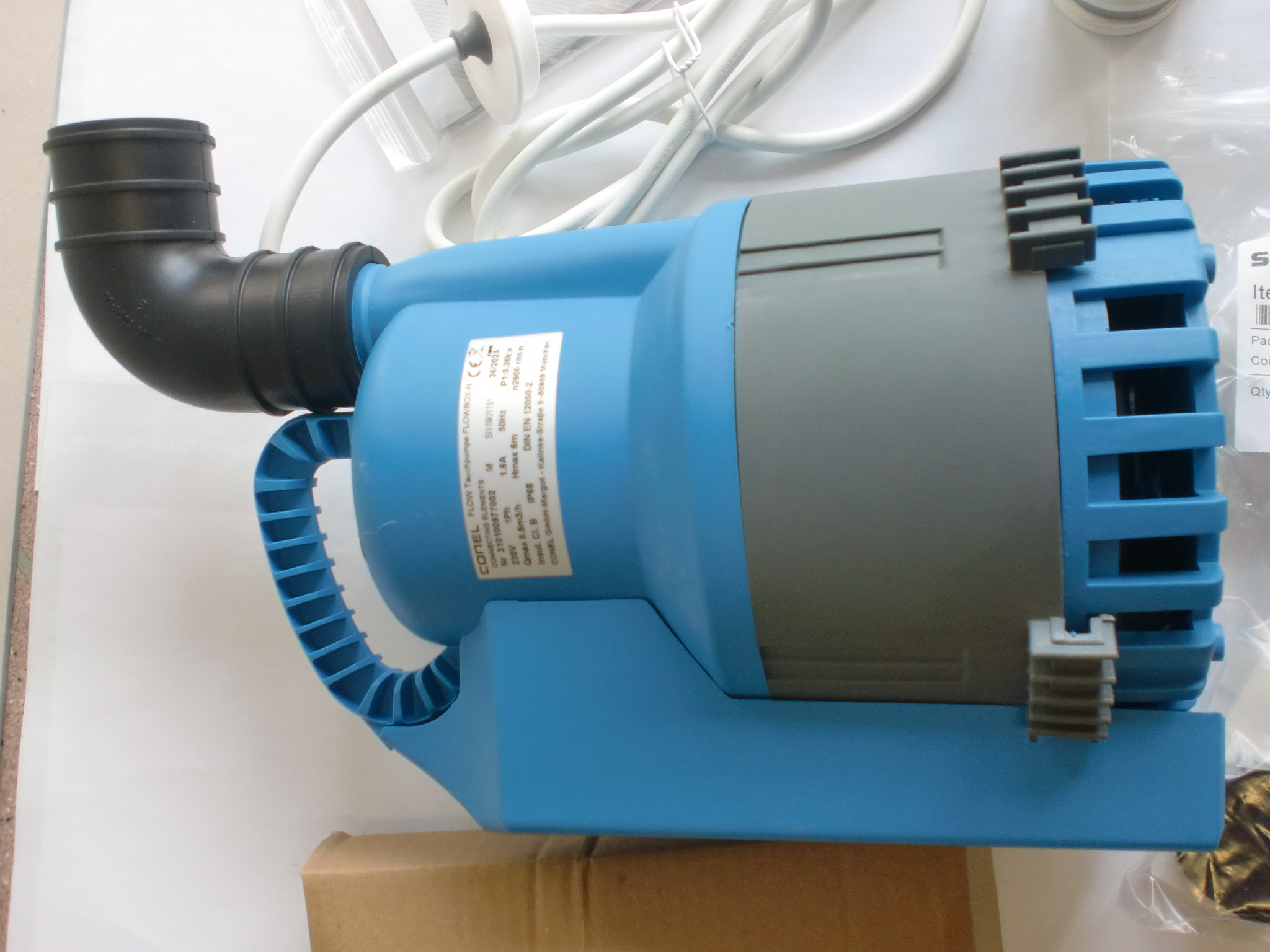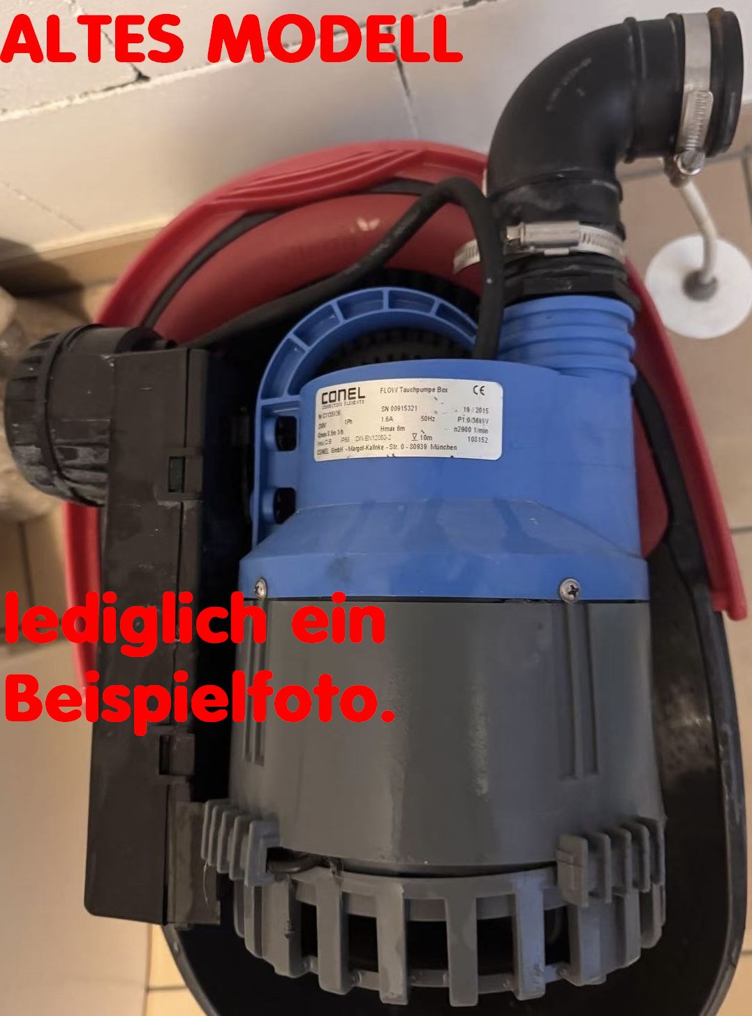 Die Pumpe der alten Flowbox Hebeanlage ( leicht erkennbar an der schwarzen Schwimmerabdeckung seitlich, siehe auch das letzte Foto) passt auch. Diese Pumpe ist leicht Abweichung in der Bauhöhe. Damit es passt wird der schwarze Gummiwinkels entsprechend minimal in der Höhe verschoben und dann mit den Schlauchschellen festgezogen.