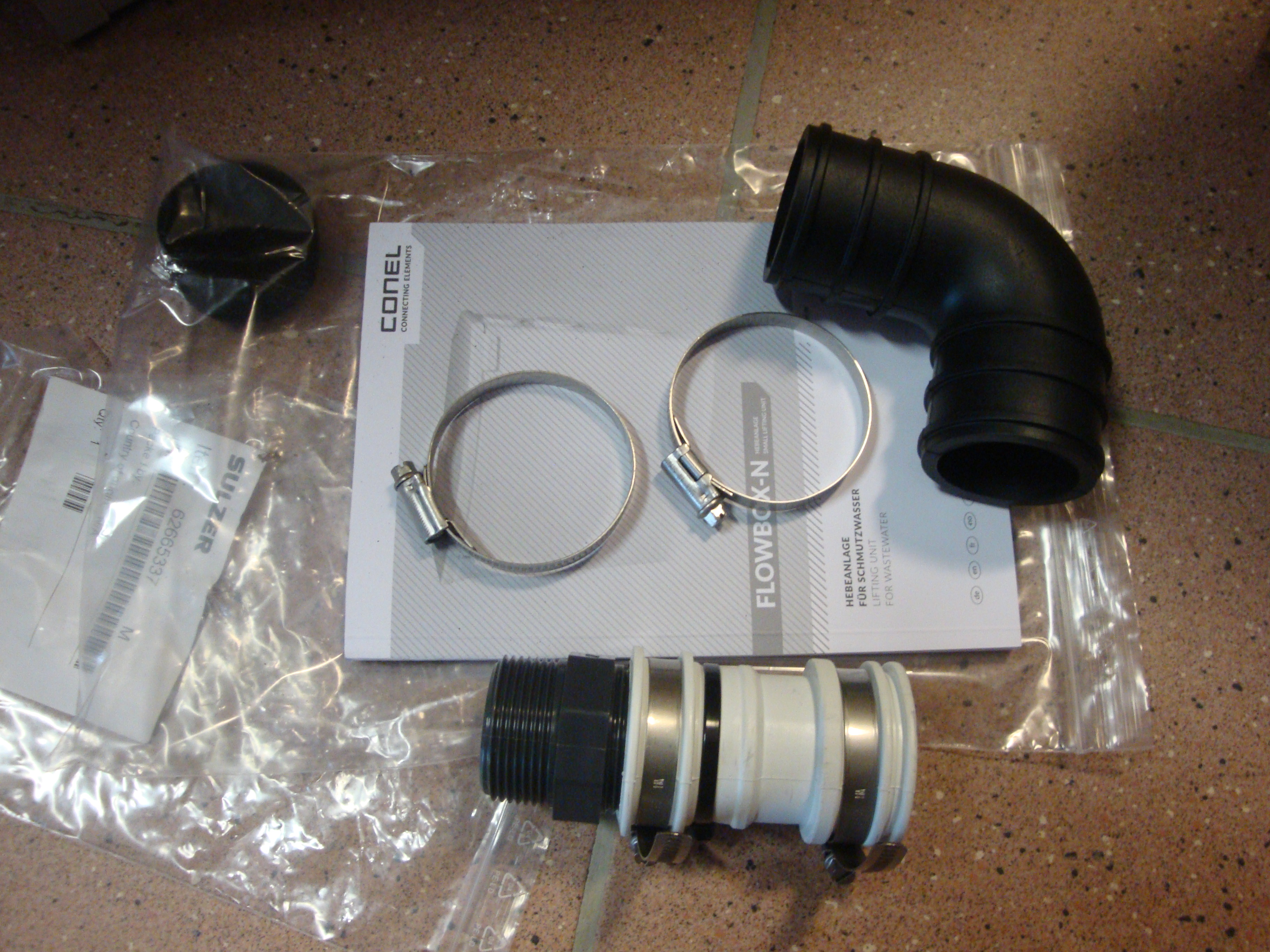 ein grauer PVC Doppelnippel 1 1/4" der bereits eine Seite in das Gummilippen Rückschlagventil verschraubt wurde, sowie noch ein rund ausgestanzter Geruchsfilter und die Anleitung der Hebeanlage.