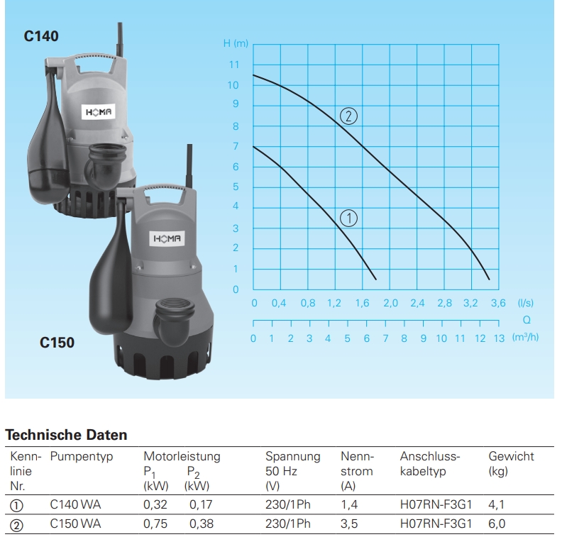 Bauart Motorumflutete Tauchmotorpumpe bestehend aus: Pumpe: Einstufige Edelstahl-Kreiselpumpe mit Kühlmantel und untenliegendem Druckanschluss. Laufrad: Offenes Mehrschaufelrad, freier Durchgang C140: 10 mm, C150: 20 mm Motor: Einphasen-Elektromotor. Motorschutz durch Temperaturüberwachung. Isolationsklasse F. Schutzart IP 68. Edelstahl-Motorwelle mit keramikbeschichteter Dichtfläche, dauergeschmierte Wälzlager. Wellendichtung: 3 Wellendichtringe