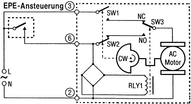 Bei Wärmebedarf wird der Reglerkontakt geschlossen, RLY1 zieht an und schließt den Kontakt NO von Schalter SW3. Dadurch wird Anschluss B geschlossen und Anschluss A geöffnet. Wenn A vollständig geöffnet ist, schließt der Nocken Schalter SW1 und öffnet SW2.
