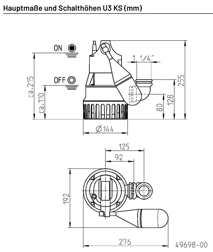Sonderschwimmer für enge Schächte(Schachtgröße min. 30 x 30 cm) Schalthöhen ohne GR EIN 265 mm, AUS 195 mm JP40856Kunststoff SchwarzEinsetzbar ab einer Schachtgröße von30 x 30 cm oder 30 cm im Durchmesser.Einschalthöhen (mm) fürohne GR mit GREin/Aus Ein/AusU 3 KS 240/ 170 270/ 200U 3 KS spez. 240/ 170 270/ 200U 5 KS 265/ 195 275/ 205U 6 K ES 245/ 165 275/ 195U 6 K DS 245/ 165 275/ 195