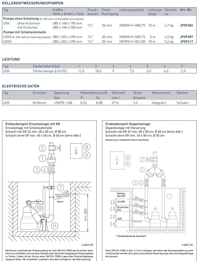 Produktinformationen "Jung U5KS Tauchpumpe Tauchmotorpumpe mit Schwimmerschalter 10m Kabel JP09417"