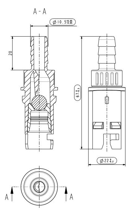 Rückflussverhinderer mit Bajonettverschluss (Durchmesser 17 mm) und Schlauchtülle für Druckschlauch 14 x 2 mm Gesamtlänge 67 mm Materialien: Kunststoff schwarz