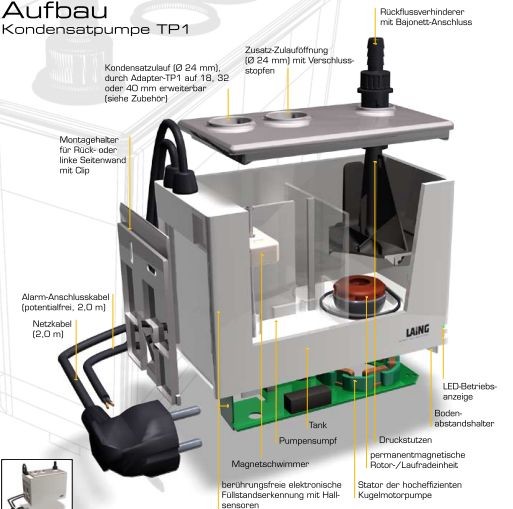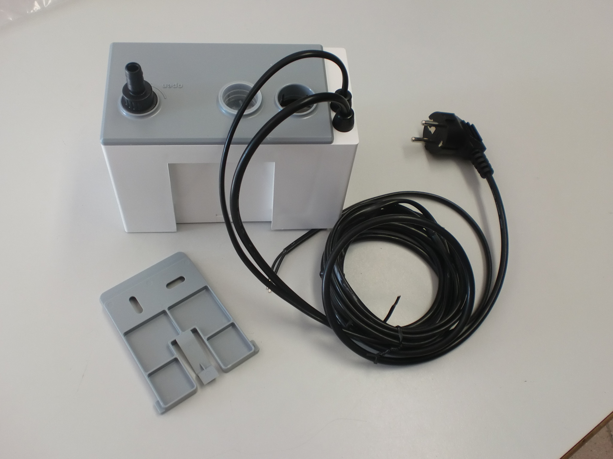 mit integrierter wellenloser Permanentmagnet-Kugelmotorpumpe und Sammelbehälter (0,5 l), Druckschlauch (6 m) mit Rückflussverhinderer, Alarm-Anschlusskabel (2,0 m), LED-Betriebsanzeige, Netzkabel (2,0 m) inkl. Schukostecker, Montagehalter für Wandmontage inkl. Befestigungsmaterial.